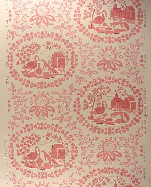 1950? Aesop's Fable Wallpaper. Pink and white. Four rolls 22" wide. $60 from Charles Luther, Mohawk, NY, through Ebay, April, '00.