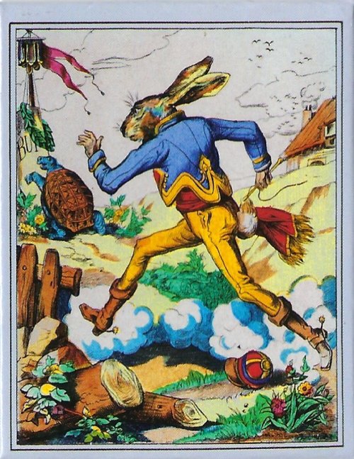 I am only beginning to learn that there is a significant market for refrigerator magnets! Here are three magnets with lovely representation of presumably older, traditional fable illustrations. That these exist was a pleasant surprise to me; that there are many other refrigerator magnets was another surprise! Now I need to find out where these traditional illustrations come from. - Source