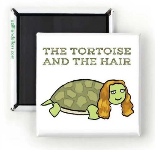2001? "The Tortoise and the Hair" magnet. Metal. 2" square. $5.75 from Azilliondollars.com through Etsy, Jan., '23.
