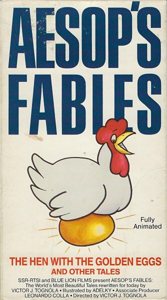 1987 Aesop's Fables III: The Hen with the Golden Eggs and Other Tales. Fully animated. Rewritten for today by Victor J. Tognola. Illustrated by Adelky. No. 1564. ©1987 Children's Video Library, Inc. $2.25 from Rachael Houdroge, Portland, OR, through Ebay, March, '00.