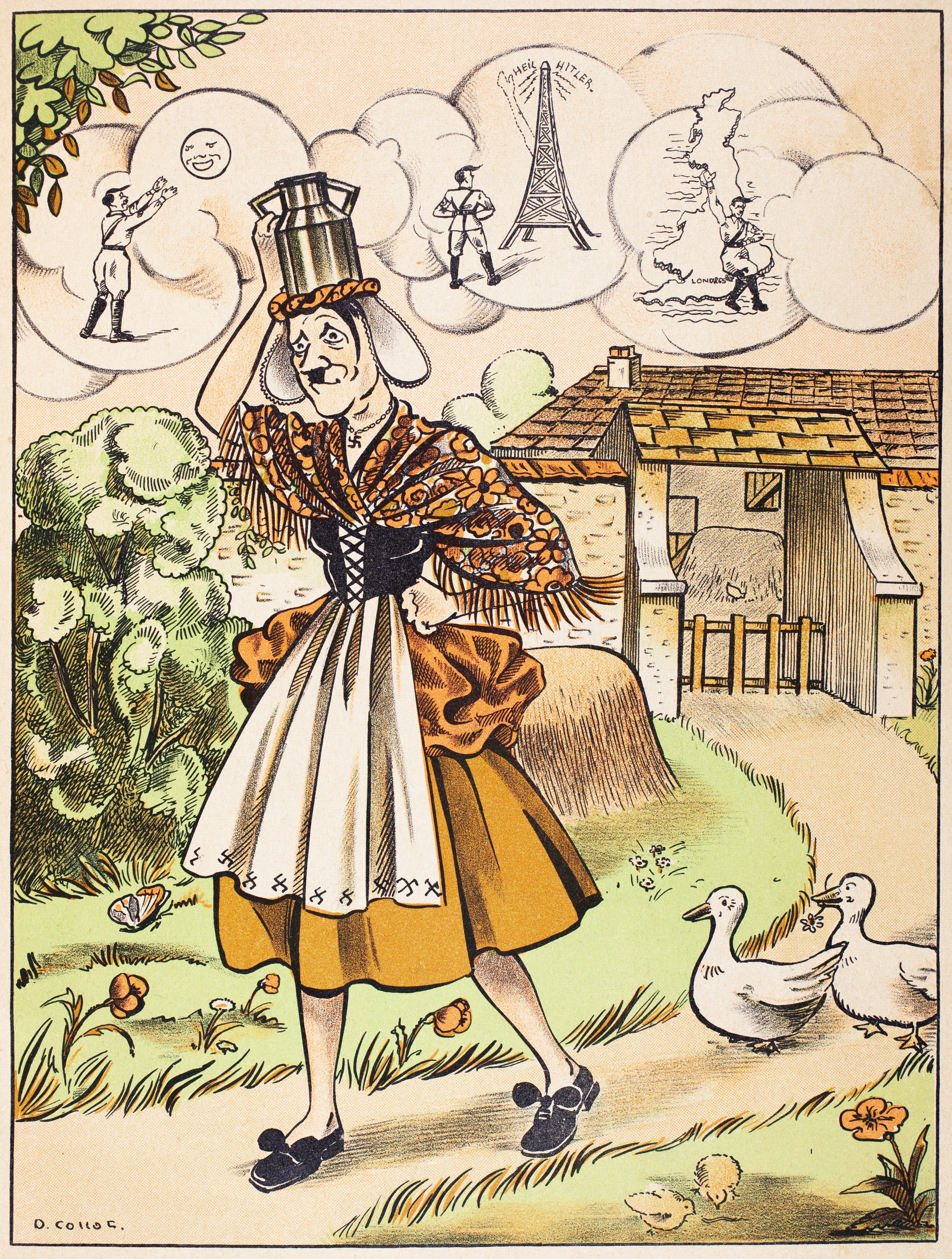 - en_US I had known several of the designs in this book for years and despaired of ever finding them. Then I found them in the 2010 facsimile reproduction of the 1939 original by Nouvelles Editions Latines. I wrote when I catalogued that edition that I was all the more eager to find an original. I had never had one in my hand. I was amazed to find this copy on eBay and even more amazed when I won the auction. This original was published shortly before the German conquest of France and the consequent destruction of materials like this, materials critical of Nazis. Ten fables are presented with their La Fontaine texts utterly intact. The blurb on the back cover of the reproduction has it right: Cet album, textes et dessins, dénonçait la férocité et la mégalomanie du chancelier allemand. In this book it is the satirical illustrations that make the difference! Several seem to me to apply less well. Among those that may seem to stretch La Fontaine in order to criticize Hitler, I would list FC and GA. Who is that asking Hitler the crow to drop the cheese that is Poland? And I would never have envisioned Hitler as the artist grasshopper needing to ask the ants for shelter…. Several illustrations, though, hit the mark perfectly! Those that seem made for criticizing Hitler have the representations that I have seen and remembered, particularly WL and MM. Hitler as a milkmaid is a riot! Notice the doll or girl lying near the lamb in WL's illustration. The Wolf Become a Shepherd portrays the shepherd as the angel of peace sleeping in the pasture. One that seems more a prophecy than a critique is OR. Who is that goddess that sends the lightning down to uproot the Hitler-oak? OF similarly looks forward to Hitler's self-explosion.
