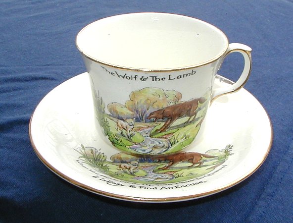 1920? Cup and saucer. Title "The Wolf & The Lamb." "When You Have Made Up Your Mind To Quarrel/It Is Easy To Find An Excuse" around the rim of the saucer. Similar hand-painted illustrations of lamb, river, and wolf on each. Gold trim around the handle and the edges of both cup and saucer. Evergreens (?), cones (?), and silver swirl patterns on the non-picture sides of both pieces. Aesop's Fables Series. Royal Winton, Grimwades. Made in England. $22 from Tamy Treso, Redvers, Saskatchewan, through Ebay, Feb., '00.