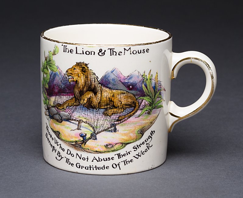 1920? Short cup 2¾" in diameter and 2¾" high. Title "The Lion & The Mouse" above the colored illustration, and "Those Who Do Not Abuse Their Strength/Benefit By The Gratitude Of The Weak" below. Gold trim around the top ring and along the front of the handle. Royal Winton, Grimwades. Made in England.