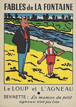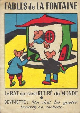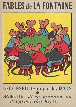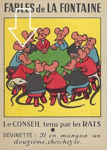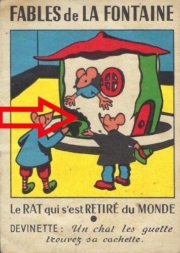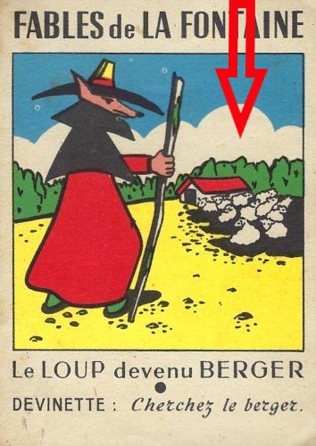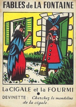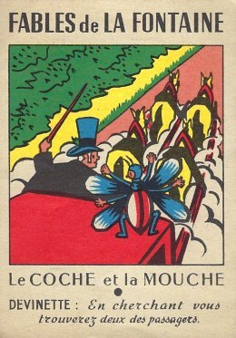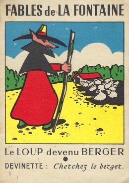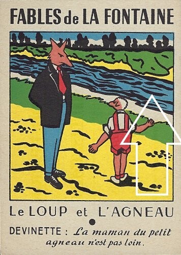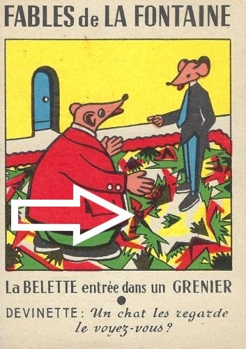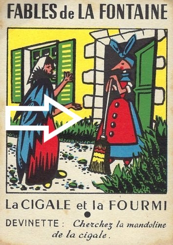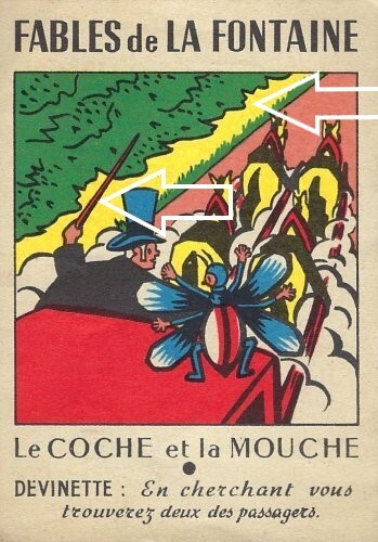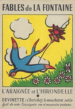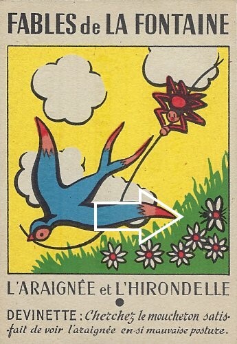 1930? Three colored "hidden picture" trade cards featuring fable titles and pictures with hidden elements. Fructines-Vichy Delicieux Bonbons. One extra of "The Spider and the Lark." $15 from Bertrand Cocq, Calonne Ricouart, France, Sept., '18. Five more cards and three duplicates, all from Pharmacie Bouchez in Amiens, for €6 from chromosetcollections through Ebay, August, '22.