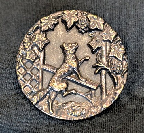 This large button varies the details of the usual FG pattern. Notice the single railing rather than two parallel railings on the fence. This fox has his left paw raised to make an attempt at the grape. In a similar vein, his right rear paw is already climbing. - Date