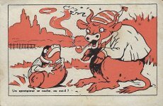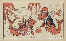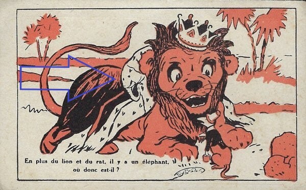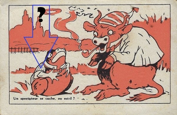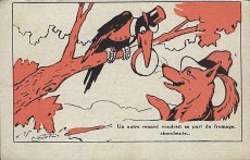 The seller identifies these as ”DLG Benjamin Rabier.” Though they remind one of Rabier’s style, I do not believe they are his work. Three clearly present fables. I am not sure what the commerce of the two fish is meant to relate to in La Fontaine. Two of the puzzle-answers were so easy that I wonder if I am not missing something obvious in the other two, which I find hard. The opening statement on the verso seems clever, but I sense that they are playing with a verb other than “aller.” - Date