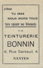 1950? Four monochrome hidden-picture cards featuring La Fontaine fables from Teinturerie Bonnin in Nantes, France. Light paper with orange coloring. 4” x 2½”. Two are signed by an artist with a name something like “Sluston.” €14.99 from place-nette-nantes on Ebay, August, ’21.