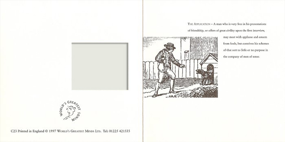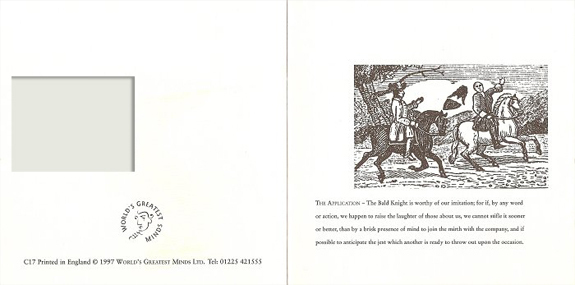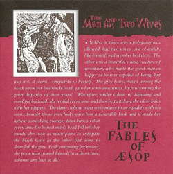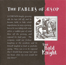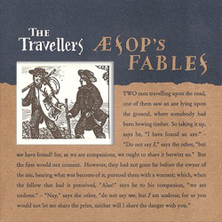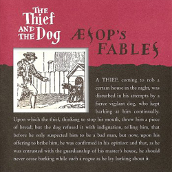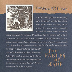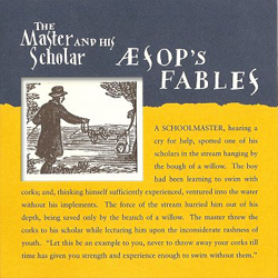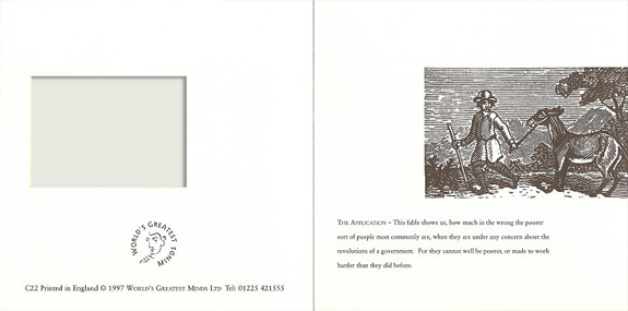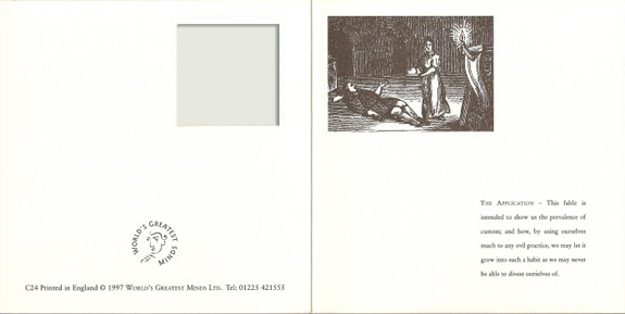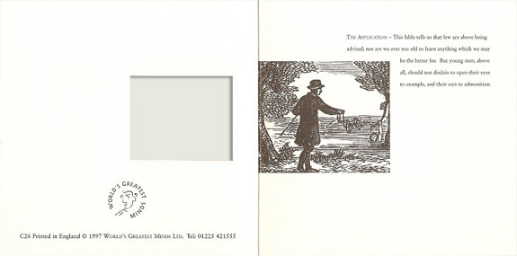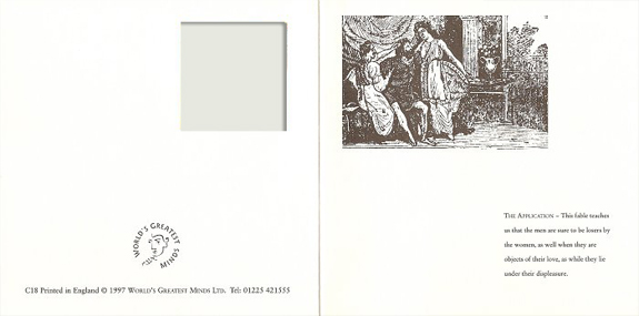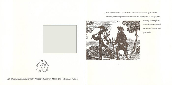 - 1997 "The Fables of Aesop." Eight cards by World's Greatest Minds Ltd, England. Each card has a window opening on a reproduction of a classic fable illustration. The outside of the card, around the window, presents the text of the fable. The inside presents the application. Stories and applications are taken, in slightly edited form, from Croxall. Gift of Maureen Hester from the Palace of the Legion of Honor, San Francisco, August, '97. Several extra copies. Click on any card to see a larger image.