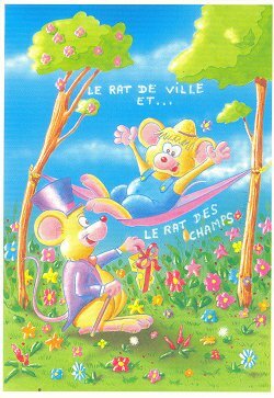 The verso of these two postcards presents a number (2244/1 and 2244/2, respectively), a title, and a boxed version of La Fontaine's fable text at the upper left. The lively images on the picture side of the card are heavy on pastels, flowers, dressed animals, and block-letter titles. In FC the rapidly falling cheese leaves a visible trail; a mouse in an open portion of the tree trunk holds his ears against the crow's bad music, while the fox laughs below. In TMCM, the country mouse offers a cheese wrapped with a bow to his coverall-clad friend in a rustic hammock. Both pictures seem devoted to making their fables cute. - Date