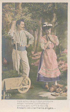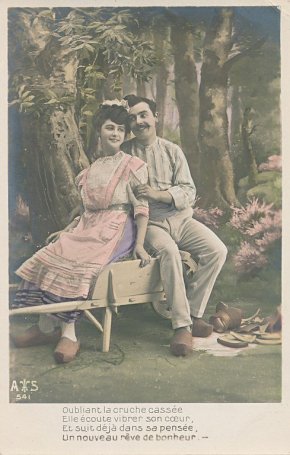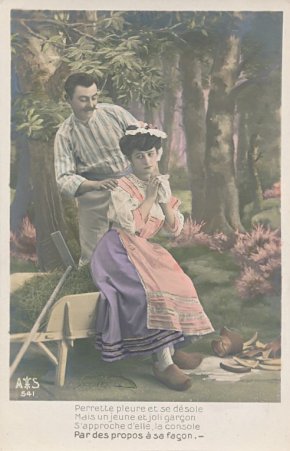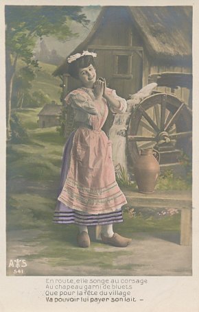 This is an unusual set in that it takes its own tangent off of La Fontaine's famous fable. As I understand the text, Perrette – first named in the fourth of five cards -- a "fermière, séduisante et coquette," is on her way to market with a large pot of milk on her head. On the way she dreams of a "corsage" that will be paid for by the milk she will sell. Alas, a false step destroys her charming projects! Perrette is weeping when a young, good looking man comes up and consoles her. As they sit close together in his wheelbarrow, she hears her heart tremor and follows a new dream of happiness. The cards do a good job of highlighting her pink apron and his blue-and-white striped shirt. - Date