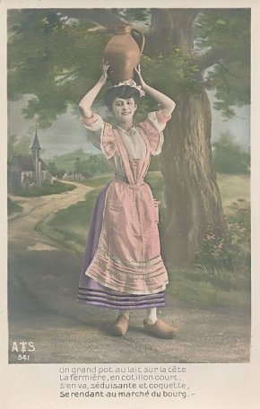1910? Complete set of 5 colored photographic postcards of the story of Perrette and the pot of milk. A&S editions #541. $60 from Bertrand Cocq, Calonne Ricouart, France, Sept., '18.