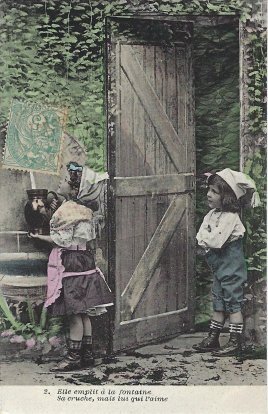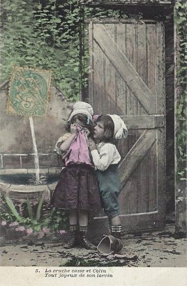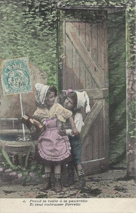 This seems to be a story built off of La Fontaine's fable, since it features Perrette, a jug, and a male. Perrette fills her jug as Colin looks on. She fills her jug, but he loves her. He describes to her the happiness of lovers. He puts his arm around her. Her jug falls and breaks, and Colin is happy over his mischief. Seeing her cry, he leads her into his house. As Bertrand writes of the set, "largely inspired by La Fontaine." Are these good lessons to be teaching French kids in 1906 or now? - Date