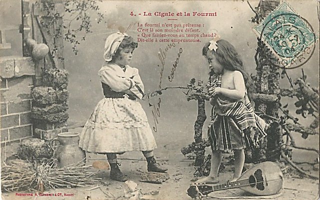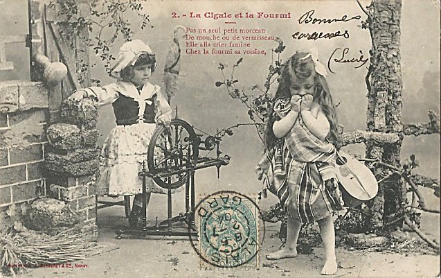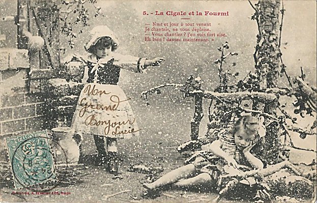 1901? "La Cigale et la Fourmi." A. Bergeret Phototypie Nancy. Five cards using children to illustrate five phases of La Fontaine's GA. Gift of Bertrand Bauvais, August, '15. One previously found card #2 for €3 in St. Ouen, August, '13. Extra copies of cards #2 and #5 from Gabriel Somobyi, Floresti, Romania, Dec., '08.