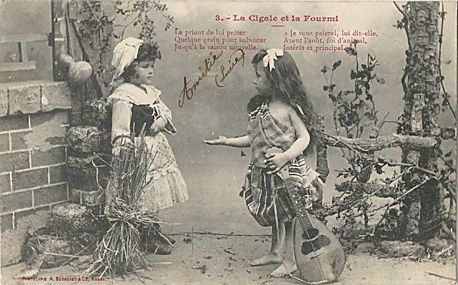 The five scenes in these postcards, acted by children, communicate a severe handling of the cicada. In the last scene, she is lying disconsolate as the "ant" directs her to go dance in winter. Spinning wheel and guitar characterize these two. Each card's front contains a few verses of the fable in red. I am amazed to have found a full set of these cards through the generosity of Bertrand and his family. Bergeret apparently moved out to present one fable in a series of photographs after offering a series of fables with one view each. - Date