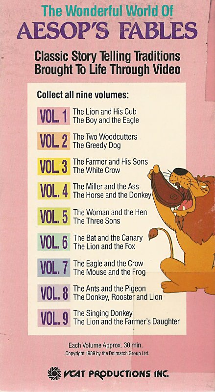 1989 The Wonderful World of Aesop's Fables: Classic Story Telling Traditions Brought to Life Through Video. Vcat Productions, Inc. Dolmatch Group, Ltd. Nine numbered packaged cassettes. $20.69 from cnksoldiesbutgoodies on eBay, June, '18. Sixteen years earlier I had put together a full set, as it turns out, by getting eight from mrndt through Ebay for $50 in December, '02, and finding the missing Volume 3 for $3 from smith71usmc through Ebay ten days later.