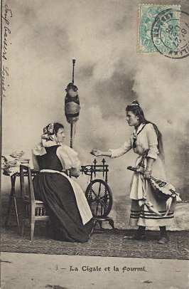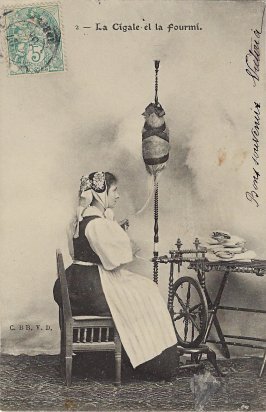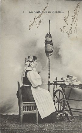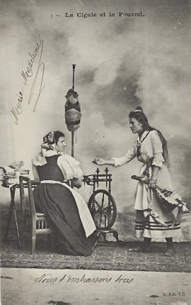 The dress of the "cicada" is similar to that in the Bergeret single photograph of this fable. The ant is dressed differently but similarly employed, namely spinning at a wheel. The series begins as La Fontaine does, with the cicada approaching the ant for help, though the poet introduces the fable with the background that the cicada had been singing all summer. The second card then focuses, more quickly than La Fontaine does, on the ant herself. Both cards include a greeting on the picture side: "Nous t'embrassons tous, Marie Madeleine." On the second card, Marie Madeleine adds "Ta Fille." It is tempting to try to decipher the date on the postmark. So far I have failed! -