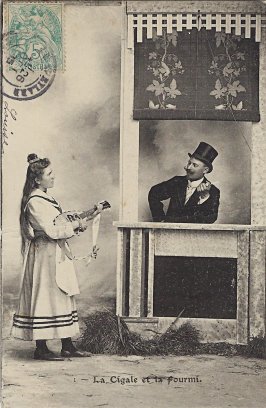 This set makes the change of having the cicada encounter a circus barker in the story's first phase. The story then turns to what is the second card in the other version: a look at the ant, apparently hard at work spinning. Then in third place comes the moment pictured first in the other set. Notice the different placement of the fable's title in this #3 card. As I noted then, the dress of the "cicada" is similar to that in the Bergeret single photograph of this fable. - Date