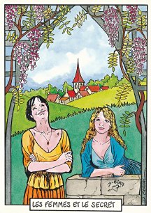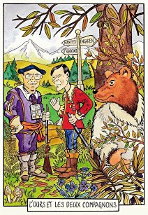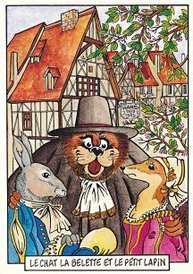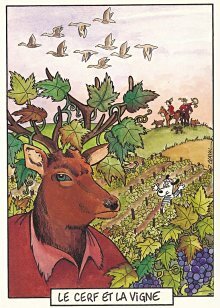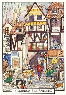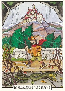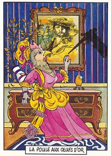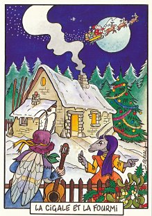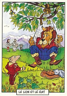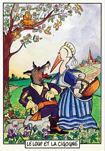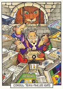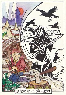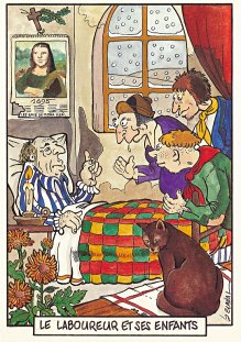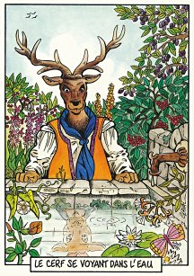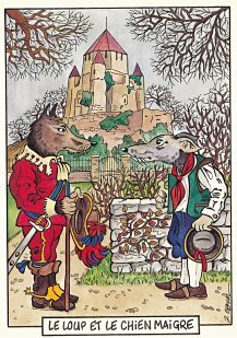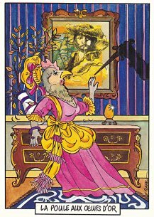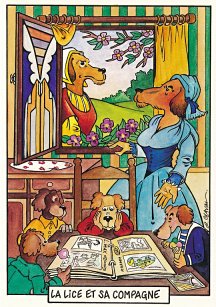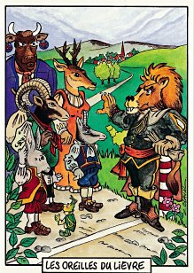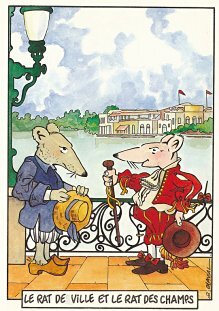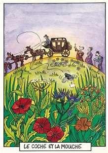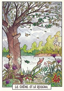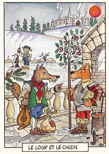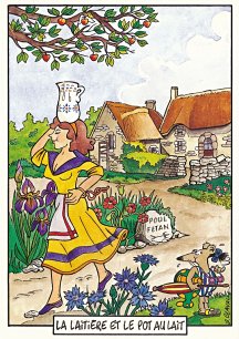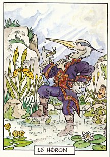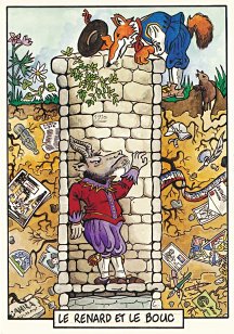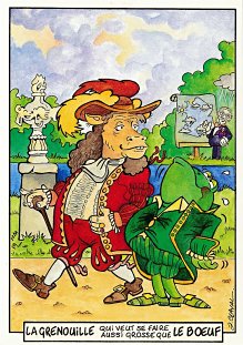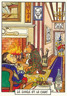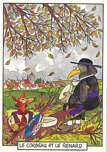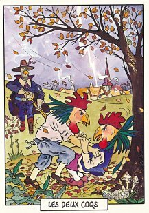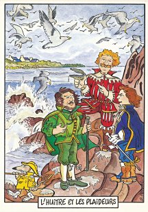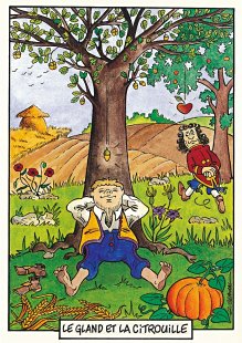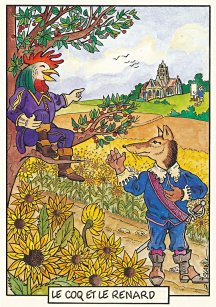 This is one of the liveliest sets of illustrations of La Fontaine's fables that I have encountered. Card after card has surprises! The ass who has crossed the river with salt holds onto a bush with a fingered hand in #2. In #9, the angler is wondering about the small fish he has caught just as a huge Jaws-like shark is ready to break the surface just below him! In "Acorn and Pumpkin" (#15), La Fontaine is walking away from and looking back at the bumpkin about to get hit on the nose by a dropping acorn. In OR (#25), for some reason, Marilyn Monroe is letting the breeze attacking the oak and reed blow up her skirt! In FC (#30), the cheese box is a particular brand, "Caprice des Dieux." On the wall of the bedroom of the dying laborer telling his sons that there is a treasure in the family field, there is a calendar from "The Friends of Mona Lisa" for the year 1695. For me, the first of the two most enjoyable scenes is "Fox and Goat" (#16), with a wild array of objects covered underground from previous eras. The other is "Cobbler and Banker" (#32): so much is going on in the village, including perhaps the artist hawking his cards! TB (#23) may be a specific contemporary political satire; the faces of the two human figures are so specifically portrayed. In GGE (#27), is someone about to kill the rich old hen? Enjoy these cards, especially in their enlarged form, occasioned by clicking on a specific card. - Date
