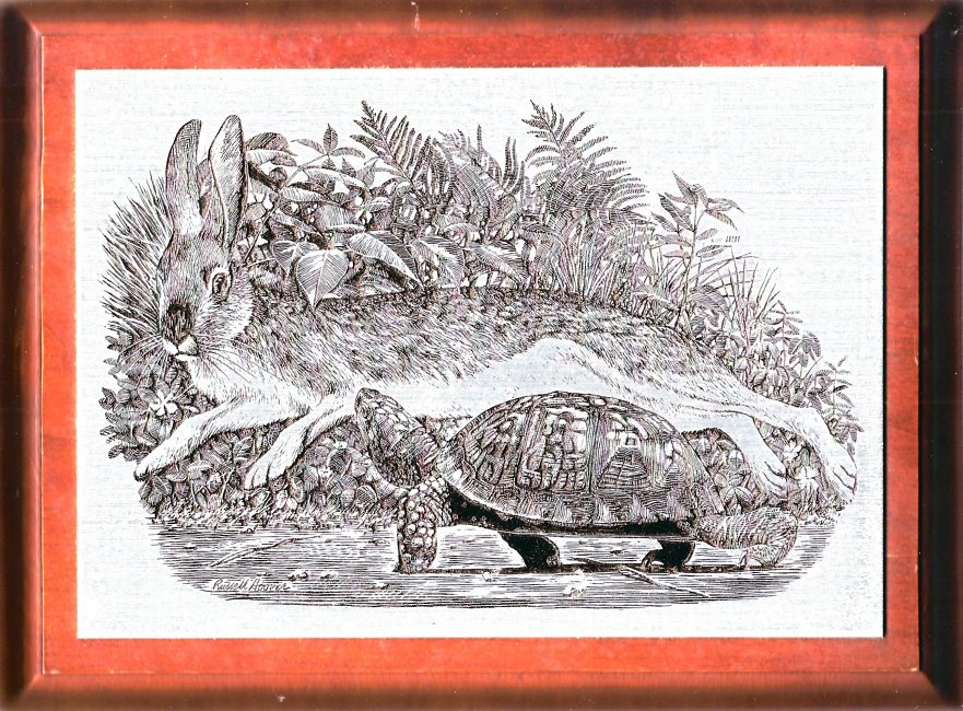 The position of the two heads and the two bodies is well done. The body of the hare half-surrounds that of the tortoise. Is the hare lying still? The tortoise is certainly not! The tortoise looks up at the hard. Is that a surprised look by the hare? A wary one? Well done! - Date
