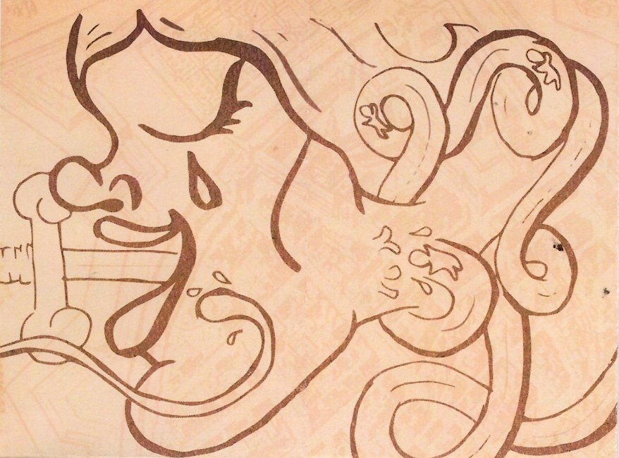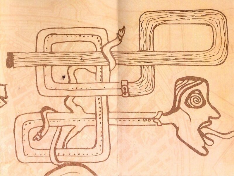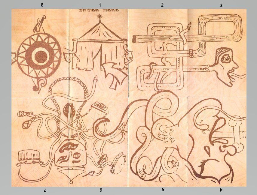 Now this is something unusual. There is first a jacket or envelope with an opening mouth that announces the title. The folded paper booklet inside this jacket goes through eight pages, one page always having a continuous design connection with the foregoing and following pages. I confess to having no idea how this is an illustration for OR! But I am happy to see Aesop celebrated. FleshBabies is Wyrick's own shop. His main construction work seems to be on fashion t-shirts. I offer below not only the sequenced pages but also the whole work as it appears before being folded into eight pages. Numbers mark the sequence in which they are to be seen. - Source