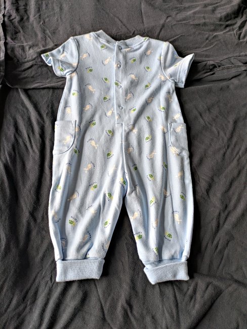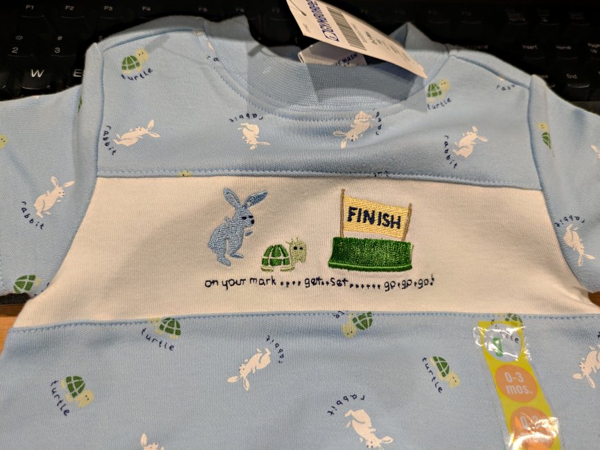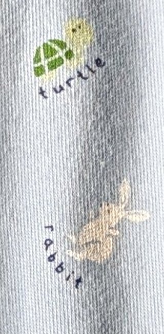 This cute garment features a lovely stiched representation near the neckline and repeated named rabbits and turtles in a pattern throughout. - Date
