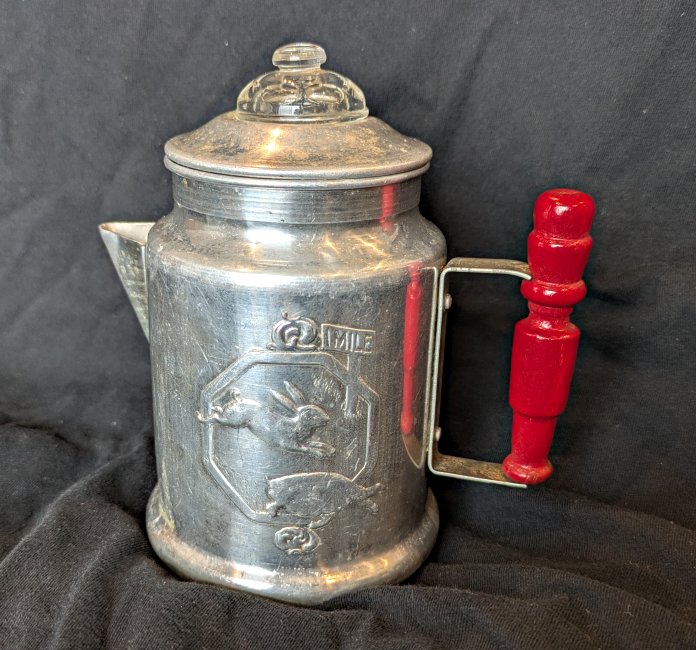 1950? TH Teapot. Aluminum and wood. 5” high. Unknown source.