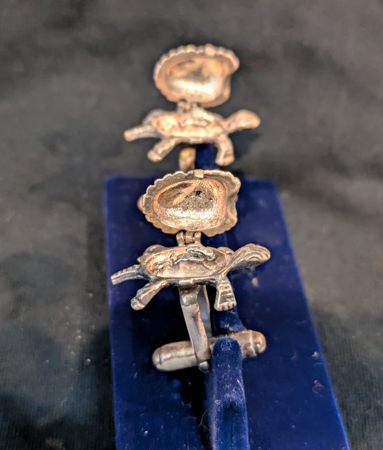 This is some of the most delicate small work in the collection! Each cufflink has a hinged tortoise back. Opening it with clumsy fingers is not easy! Does the Hallmarket Silver box belong to this exquisite pair? And what brings a person to wear openable tortoise-and-hare cufflinks? Matched tortoise cuffliniks seem common enough on the web. I have not yet found TH cufflinks. - Date