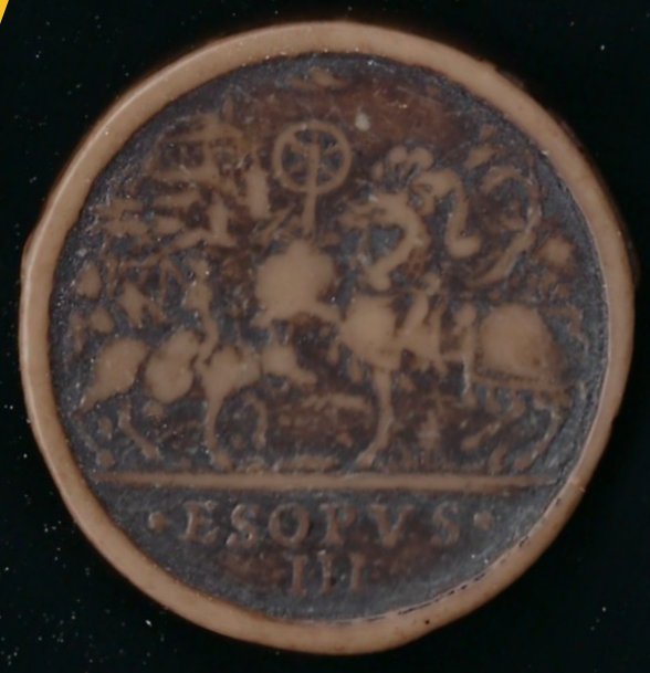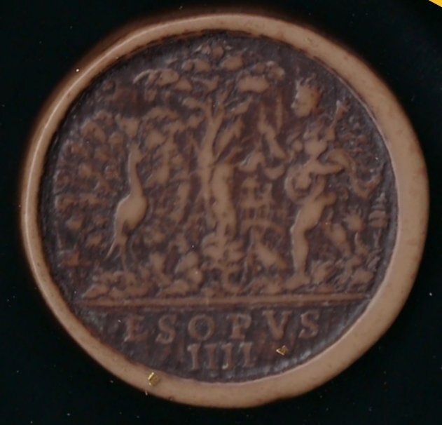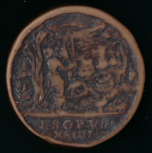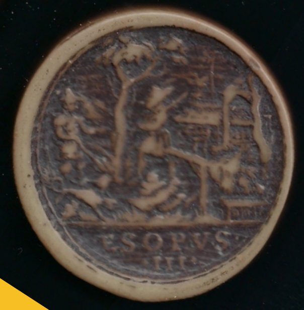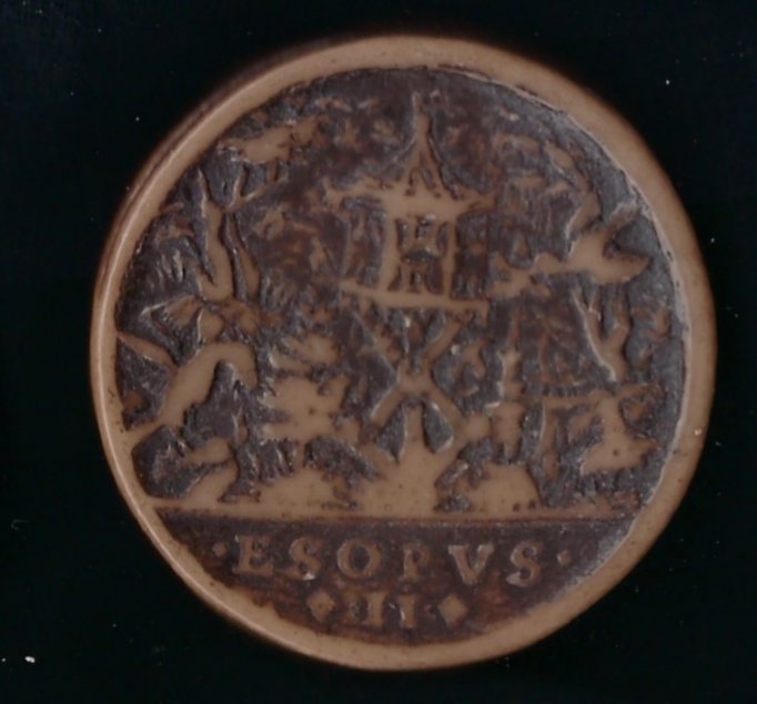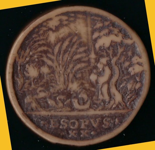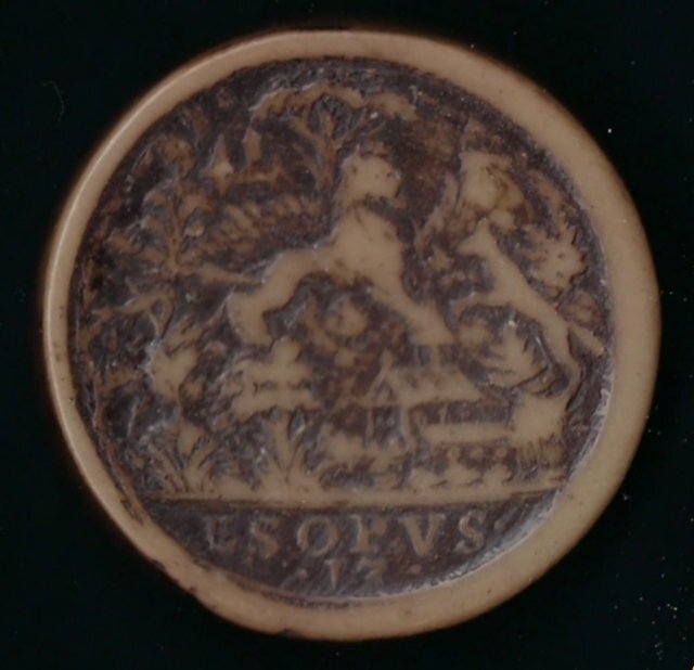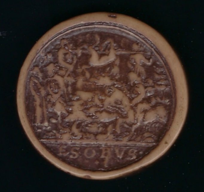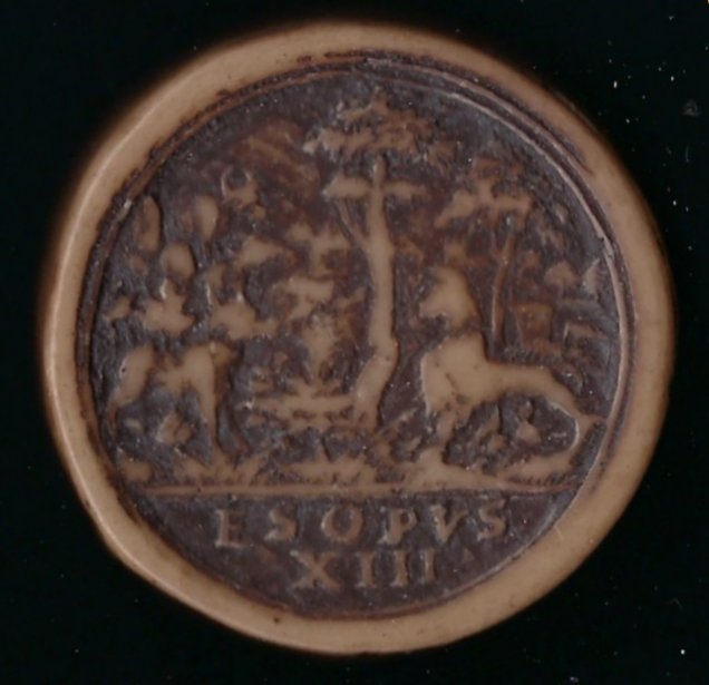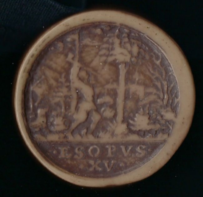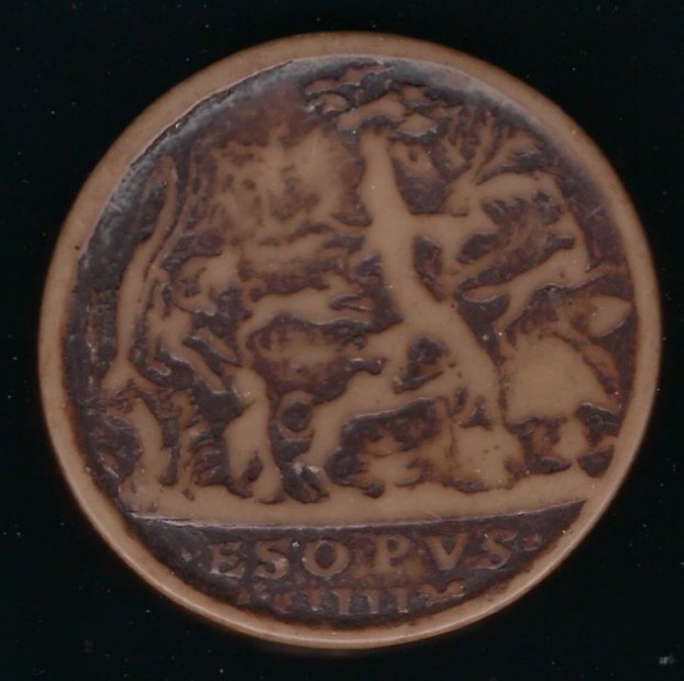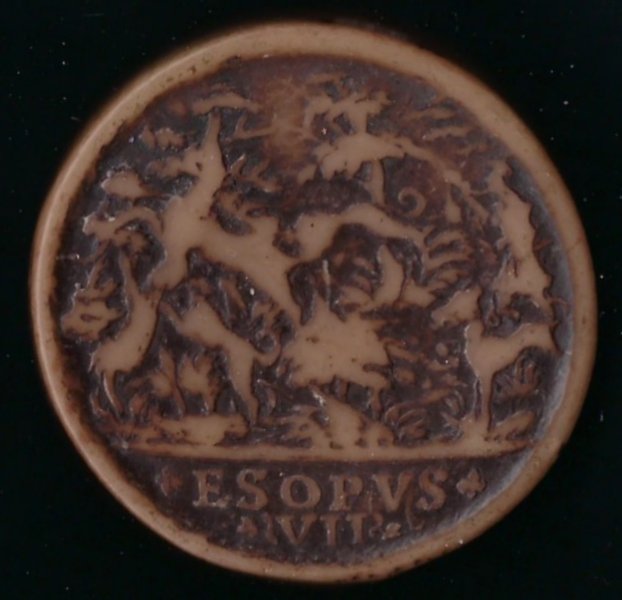 These are so worn that it is often difficult to make out what fable is being presented. Oh, to find some listing of them online that would make sense of the numbering system at the bottom of each. On the tan checkers, the verso is always "Stag at the Pool" (if that is indeed the right name for this common verso). The black and tan sets are identical -- and both deeply worn. - Date