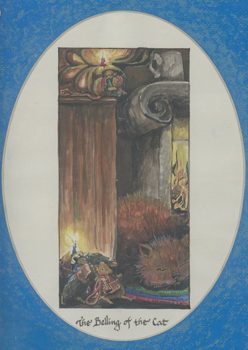 1970 "The Belling of the Cat." Water-color and ink panel by Lisa Haderlie. 4" x 7½" on paper set inside oval matting and framed in glass. $25 from William Hayes at the Alameda flea market, Jan., '02.