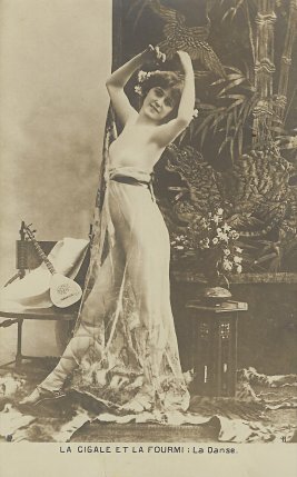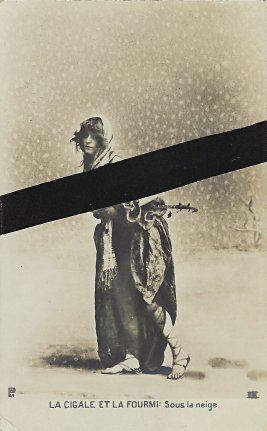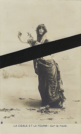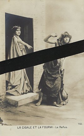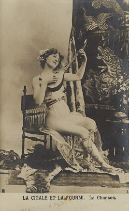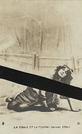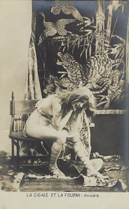 Various series of photographic postcard presentations of GA have flirted with the presentation of the grasshopper as a human pinup girl. This series may go furthest in the direction of conflating a set of fable cards with notorious French picture postcards of nude women. This series, rare and larger than the usual series of five or six cards, has an unusual feature of using a one-noun description of each of the phases of the story. Wanting to give a sense of the cards we have without giving scandal, I have slightly censored some of the cards. A trademark in the lower left corner of each photograph offers a clue – but a hard one to decipher – about the publisher of the cards. I show images of the two missing cards to help visitors to see the complete series, including the dire ending. - Date