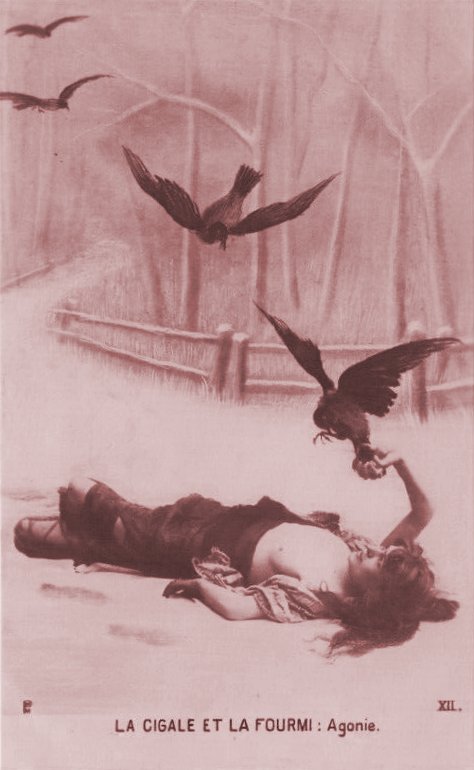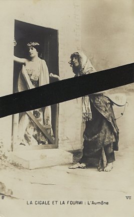 1900? Ten (of 12) photographic postcard presentations of "La Cigale et la Fourmi." $120 from Bertrand Cocq, Calonne Ricouart, France, Sept., '18.