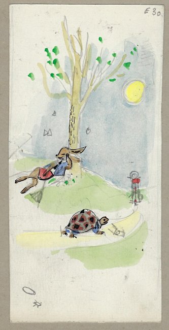 Here was one of two surprises in a blisteringly hot weekend foray to the Marché aux Puces! "Daniel et Lilli" is basically a button shop on the first floor of the Marché Dauphine. I did find buttons, but I found more brooches and drawings. The helpful attendant just kept bringing me more things! These lovely finds made up for an otherwise not-so-successful day. The bunny sleeps blissfully against a tree while the tortoise passes by. What lovely work, and what a lovely "save" from the fate of most ephemera for this one-of-a-kind object! - Source