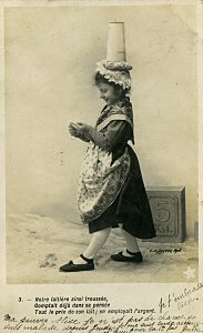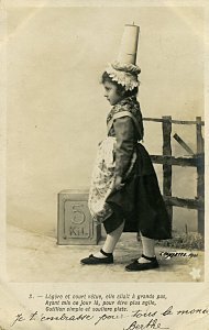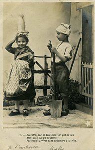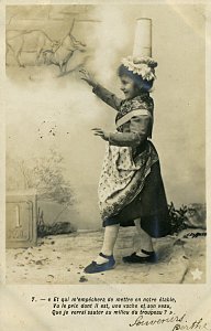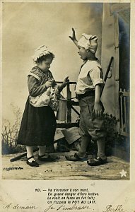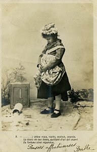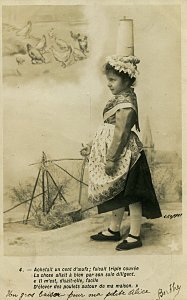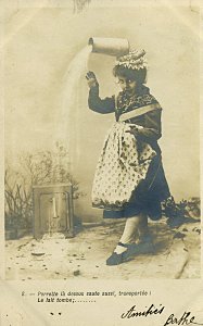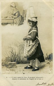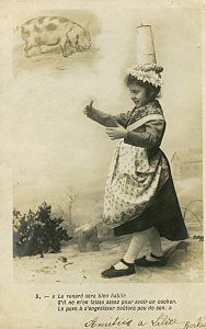 The approach of these cards is similar to those Bergeret phototypes, "Bébé Fabulist," and "Perrette Montrut, presumably from the same period. These include the appropriate verses of the fable with each picture. As with them, the message goes on the picture side of the postcard. The verso is entirely for stamp and address. Each card is signed by "Berthe" and several have endearing messages. The scene is portrayed entirely by children. The "pot" of milk has a curious tall shape here, something between a butter churn and a coffee pot. The fourth through seventh pictures use a rather primitive way to indicate Perrette's dreaming: an image of the appropriate future animal is pasted into the picture. The eighth picture may be the most curious, as the picture composer works to make the pot seem to be falling and spilling. - Date