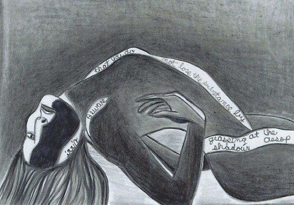 The backwards writing says "Beware that you do not lose the substance by grasping at the shadow. Aesop." I am delighted to see how widely Aesop's DS story gets around. I tried seeing if there was an allusion in this evocative drawing to that story, but I think that the artist's intent is to draw attention rather to the play of light and shadow. Good advice, well echoed here! - Source