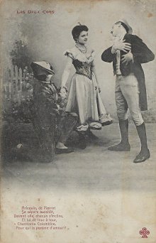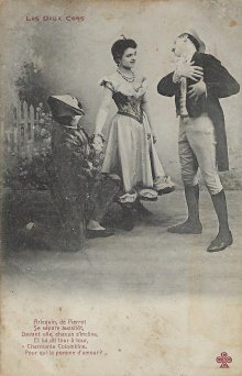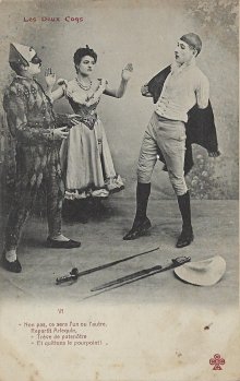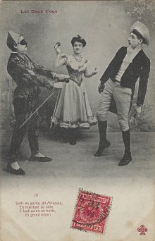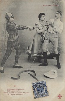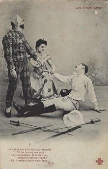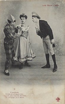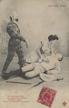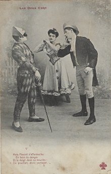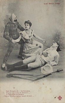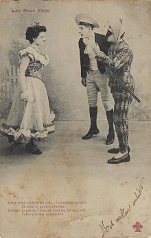 Arlequin and Pierrot do fine until Columbine enters the picture. The ten photographs spell out the drama to its sad end. A little research led me to Charles Collas & Company of Cognac, strong early promoters of the postcard. The company had three booths at the great Paris fair of the postcard in 1904. This set is unusual in miy experience for having ten cards. I am as excited as Bertrand that he was able to find – or build -- a complete set. After the first card, the text and story depart from La Fontaine's fable. I cannot say that I follow this version's twists and turns to its sad end. - Date