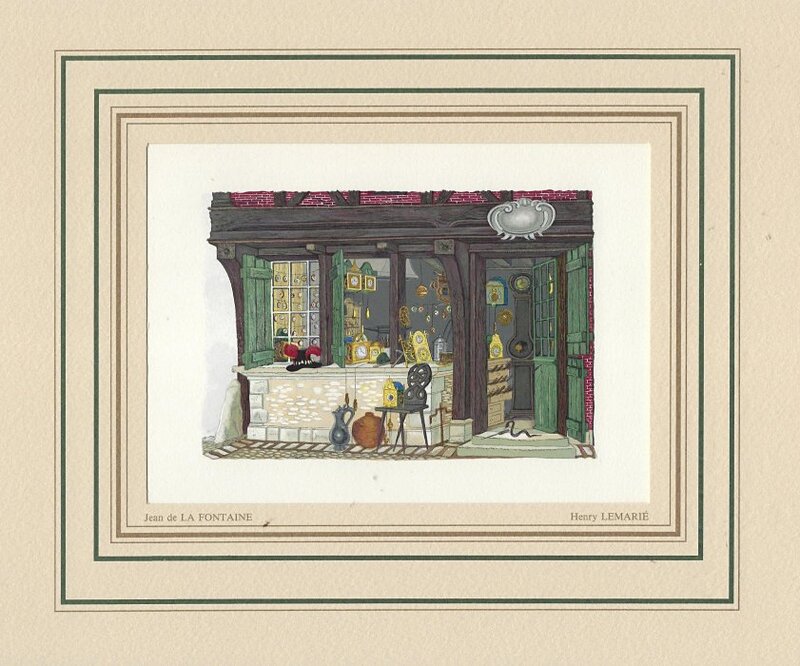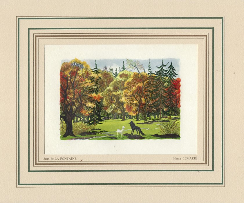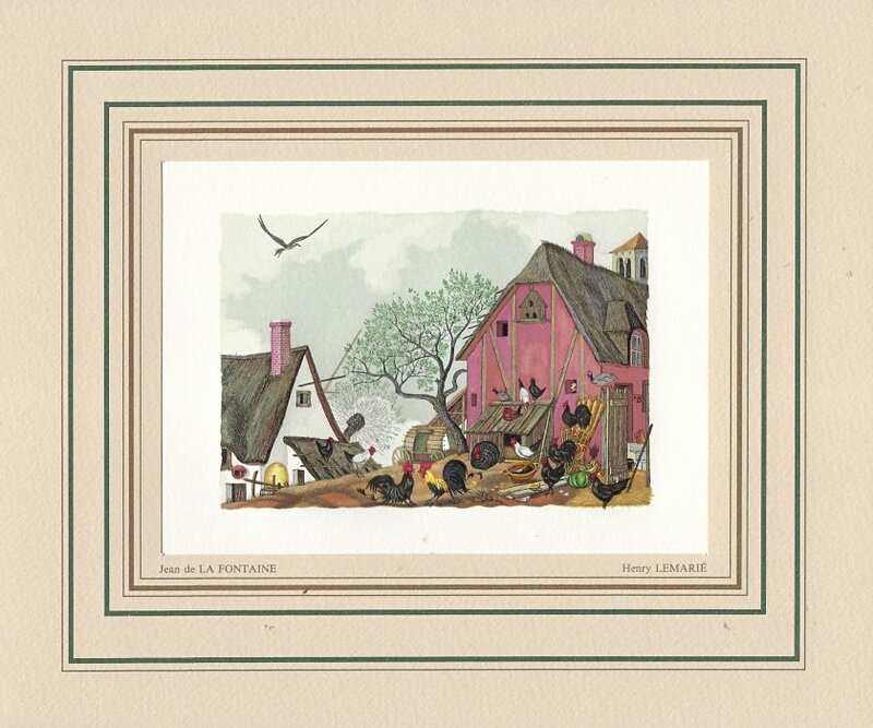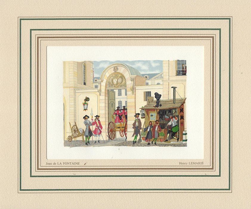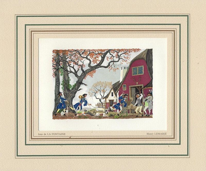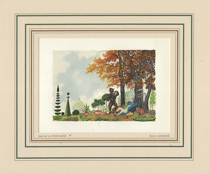I have found LeMarié's miniatures delightful since I first saw them. This set is gorgeously presented. They seem to reproduce the illustrations in LeMarié's edition of 1996, over which I have expressed my delight. I wanted to include LeMarié's "Cobbler and Banker" in the Joslyn exhibit, but the art is too small. As I learn more now, I wonder how this kind of colorful work can be done on woodblocks. How many passes does it take on the poor piece of paper? I see this set of prints as an excellent showpiece for the collection. Jean Taricco engraved some 2200 pieces of wood necessary for the reproduction of the aquarelles of Henry LeMarié. Apparently some 30 colors were applied. - Source