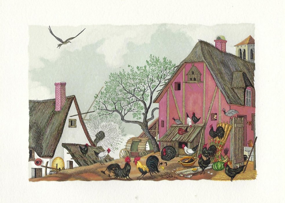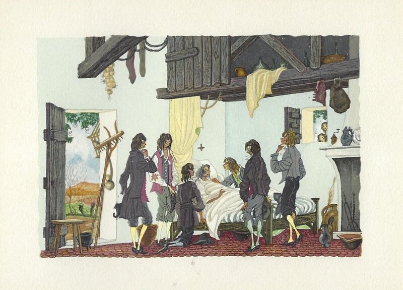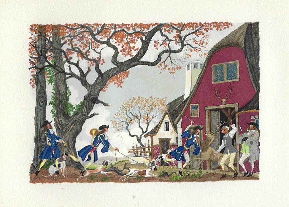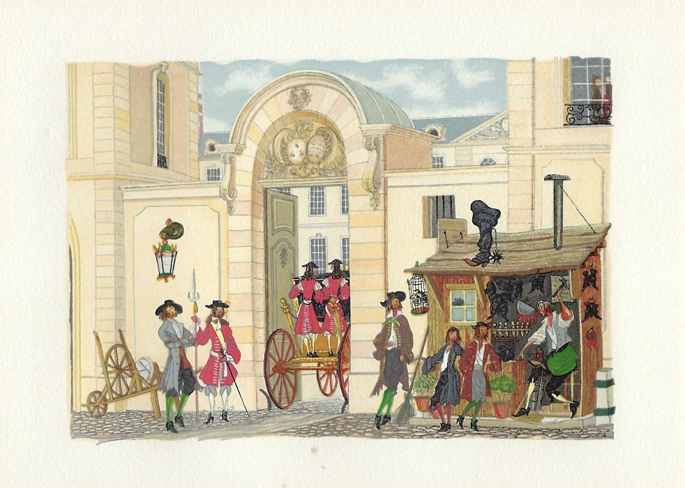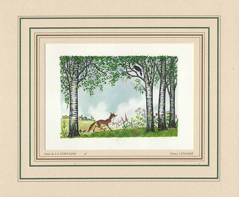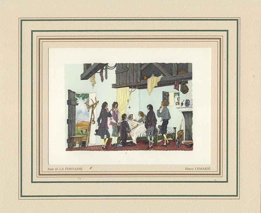 I have found LeMarié's miniatures delightful since I first saw them. This set is gorgeously presented. They seem to reproduce the illustrations in LeMarié's edition of 1996, over which I have expressed my delight. I wanted to include LeMarié's "Cobbler and Banker" in the Joslyn exhibit, but the art is too small. As I learn more now, I wonder how this kind of colorful work can be done on woodblocks. How many passes does it take on the poor piece of paper? I see this set of prints as an excellent showpiece for the collection. Jean Taricco engraved some 2200 pieces of wood necessary for the reproduction of the aquarelles of Henry LeMarié. Apparently some 30 colors were applied. - Source