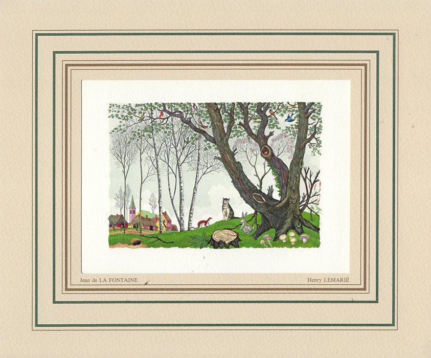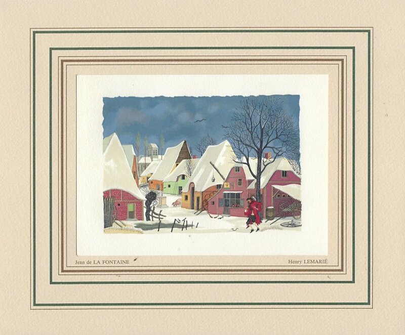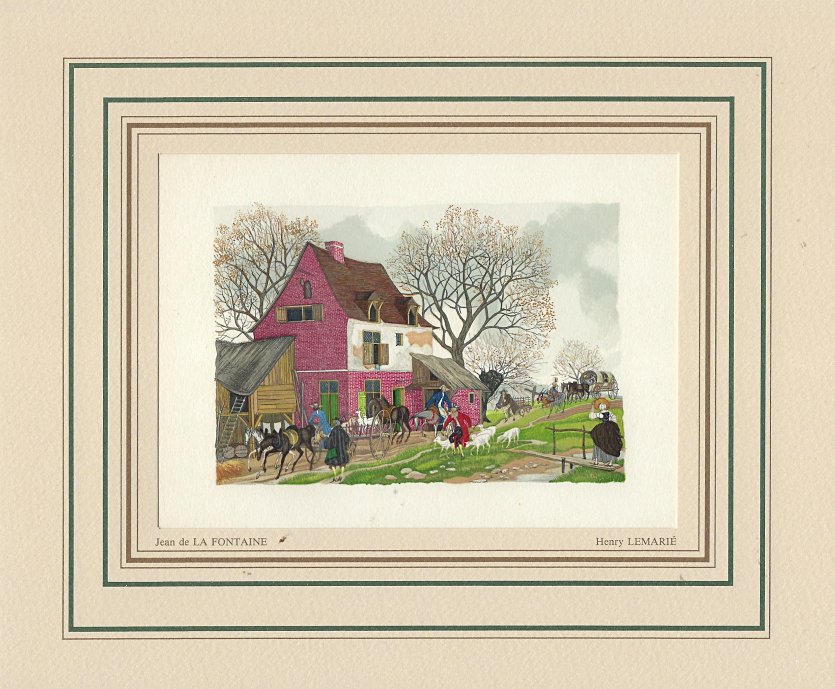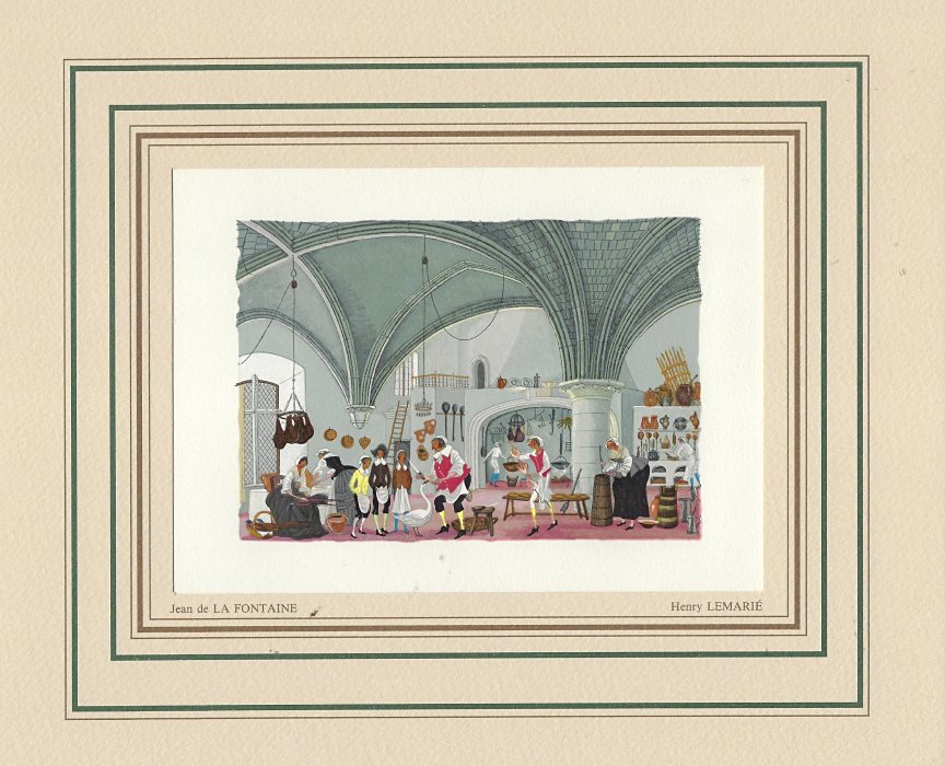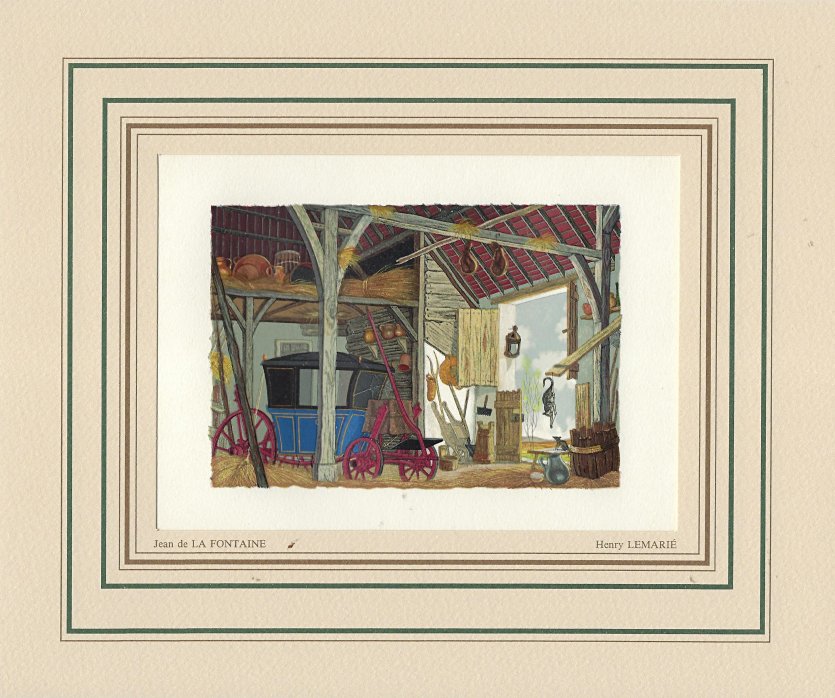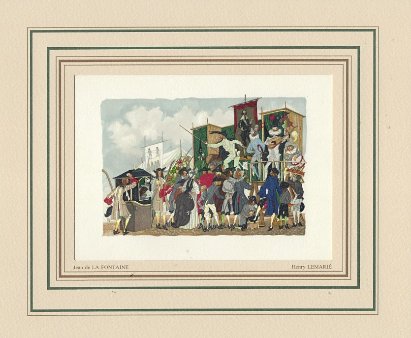 I have found LeMarié's miniatures delightful since I first saw them. This set is gorgeously presented. They seem to reproduce the illustrations in LeMarié's edition of 1996, over which I have expressed my delight. I wanted to include LeMarié's "Cobbler and Banker" in the Joslyn exhibit, but the art is too small. As I learn more now, I wonder how this kind of colorful work can be done on woodblocks. How many passes does it take on the poor piece of paper? I see this set of prints as an excellent showpiece for the collection. Jean Taricco engraved some 2200 pieces of wood necessary for the reproduction of the aquarelles of Henry LeMarié. Apparently some 30 colors were applied. - Source