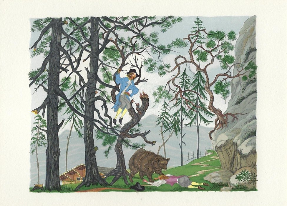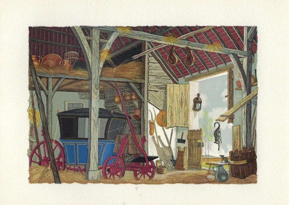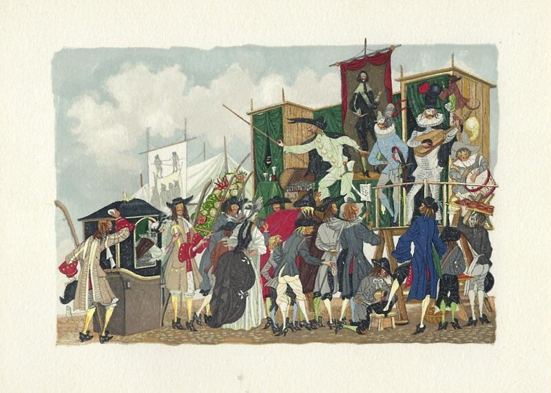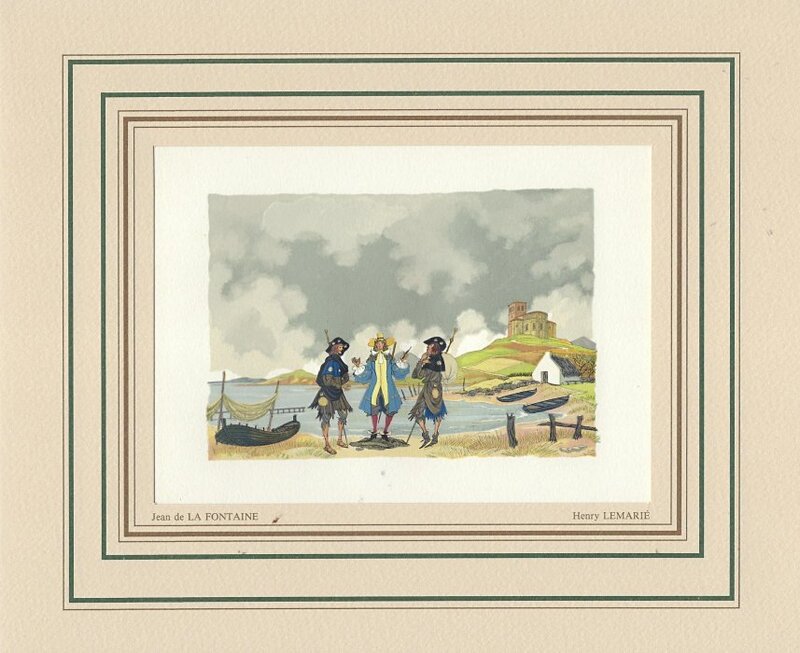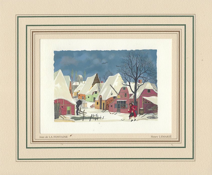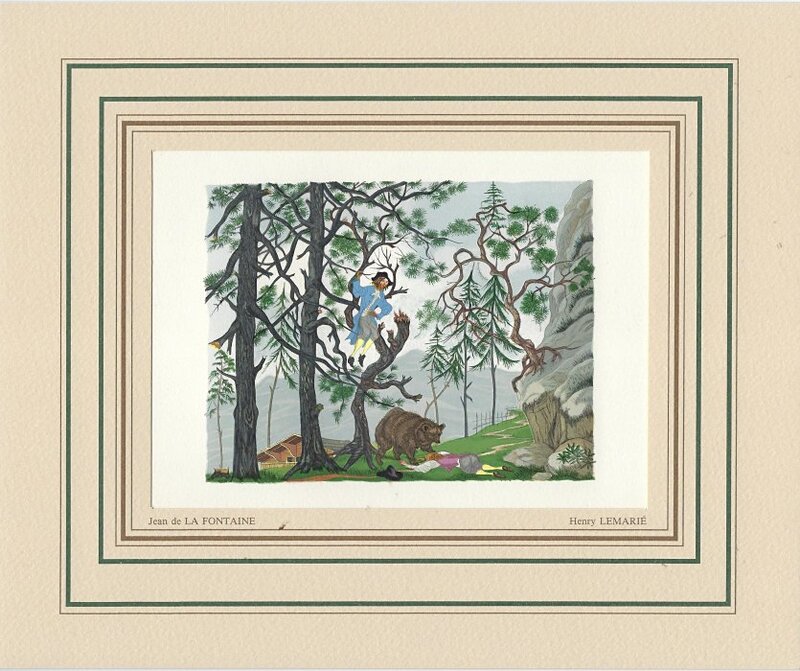 I have found LeMarié's miniatures delightful since I first saw them. This set is gorgeously presented. They seem to reproduce the illustrations in LeMarié's edition of 1996, over which I have expressed my delight. I wanted to include LeMarié's "Cobbler and Banker" in the Joslyn exhibit, but the art is too small. As I learn more now, I wonder how this kind of colorful work can be done on woodblocks. How many passes does it take on the poor piece of paper? I see this set of prints as an excellent showpiece for the collection. Jean Taricco engraved some 2200 pieces of wood necessary for the reproduction of the aquarelles of Henry LeMarié. Apparently some 30 colors were applied. - Source
