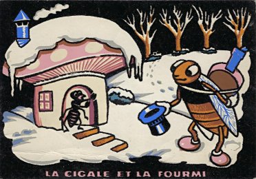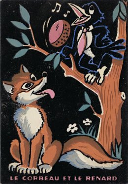 1964? Four E.S. Creation Carrère "en feutrine" black-background felt cards of La Fontaine's fables. E.S. Paris. $8 each from Bertrand Cocq, Calonne Ricouart, France, Sept., '20. Extra copy of FS for $8 from Cartophilian Collectibles, Cheshire, CT., Jan., '01.