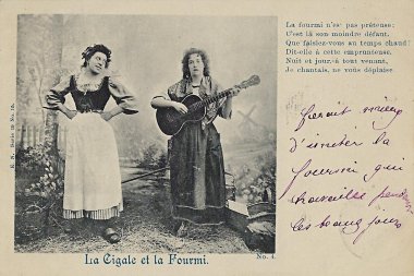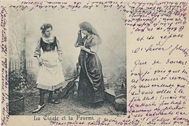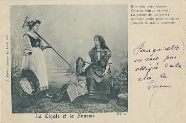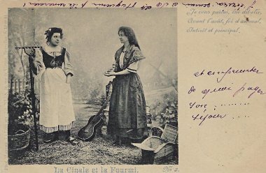 1900? "La Cigale et la Fourmi." Complete five card numbered postcard set. From various publishers. $35 from Bertrand Cocq, Calonne-Ricouart, France, Sept., '20.