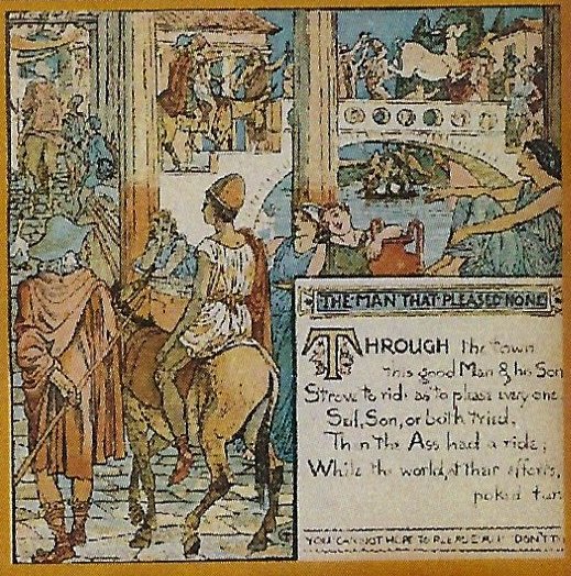 - Twelve 1¾” square thin wooden tiles representing each a page from Walter Crane’s book of Aesop’s fables
