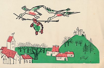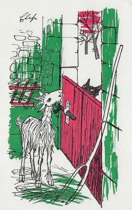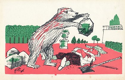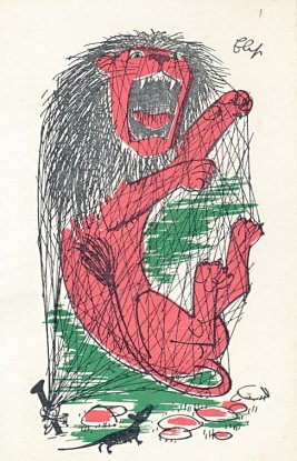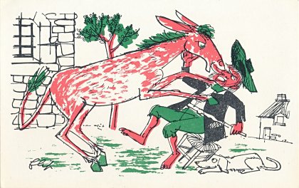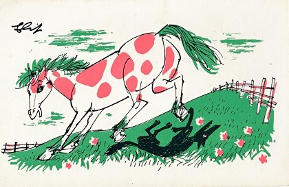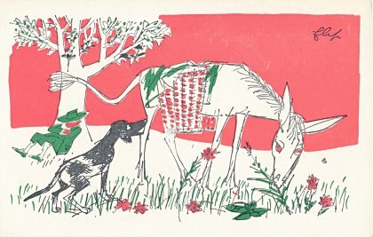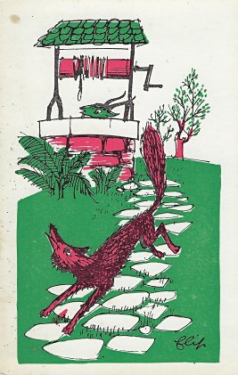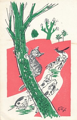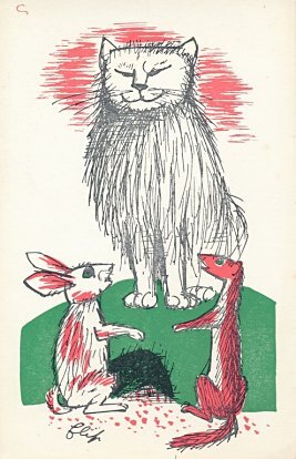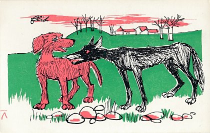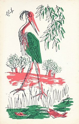 The artist brings together red, green, and black effectively in these lively cards. Among the strongest are "Wolf and Horse" (#7), "Bear and Gardener" (#17), and OF (#19). The colors are unfortunately poorly aligned on "Heron" (#14). Now to find the other six (?) cards! - Date