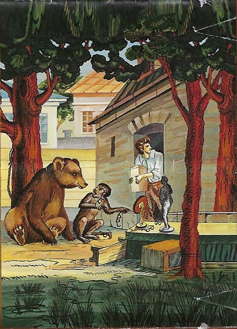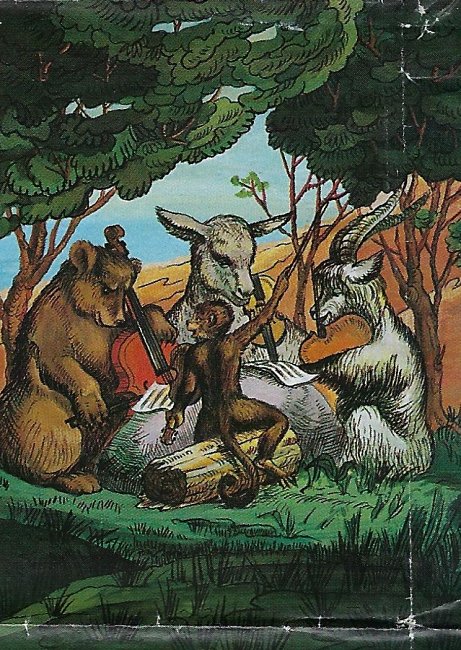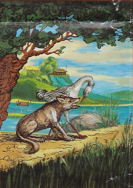 - These four large (8½" x 8") wrappers include a lovely fable picture, which I offer here in each case as a detail. Do not miss what I believe is a double fable representation in the last wrapper. I believe that the artist is representing two fables at once. Might the human figure there suggest even a third fable?