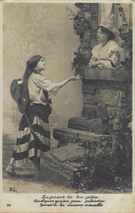 This set is unusual for including ten cards rather than the usual six. It has every scene working from the same stage, and that arrangement may violate the fable for the cicada's summer singing, which here needs to be before the ant's window. Where did the ant get that fancy headdress? The ninth card looks as though the ant may be inviting the cicada into her protection in her cape. For me, the final scene is pictorially not clear. I believe that we are seeing the back of the ant as she walks away, rejecting the cicada and leaving her to the onslaughts of winter. The versos of all ten cards are blank. As so often, in French presentations of this fable, we see the cicada as a lovely young barefoot woman with a guitar. - Date