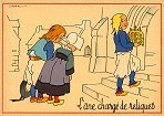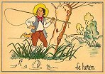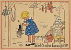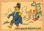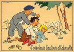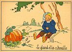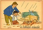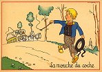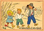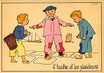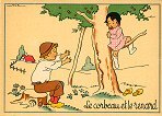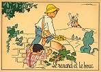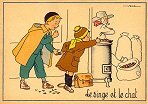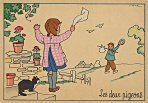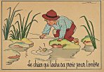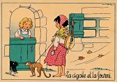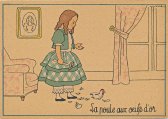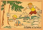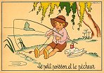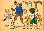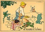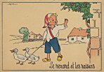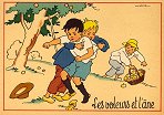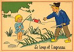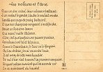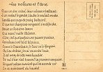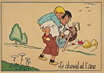 - 1947? La Fontaine's Fables in children's scenes. 18 cards produced by M. Barré and J. Doyez, Paris. The artist's signature seems to be "Lack" or "Jack." Series 1426; each card has a different letter following that number. No. 614. The fable is printed in script on the message side of the post card. At about the same time, this publishing firm did a series of colored postcards by Starling. Imprimé en France. 30 Francs each from Normand Antiquités at the Marché aux Puces, Clignancourt, May, '97 and July, '98. 45 Francs each for eleven cards from M. d'Autreppe at Clignancourt, August, '99. Fourteen more cards for €4 each, St. Ouen, August, '17. Persistence has paid off: I now have what I believe are the last two cards ("D" and "H") for $12 from Bertrand Cocq, Calonne Ricouart, France, Sept., '18.