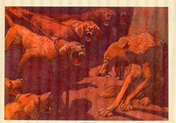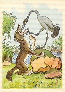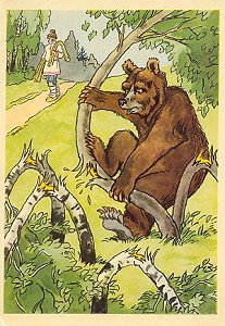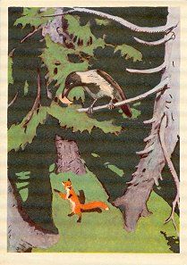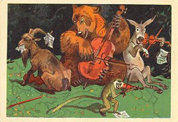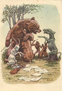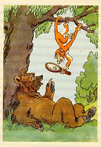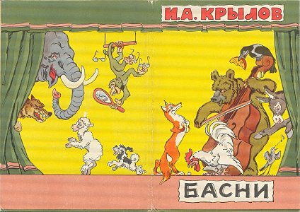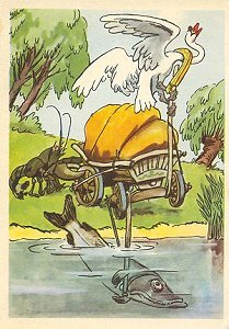 1970? Ten cards displaying lively colored illustrations of Krylov's fables. The artists for these cards are A. Bazhenov. At least some of them seem to have been produced in Kaliningrad. Unknown source, July, '03. Extra copies of "A Quartet" (IV 1), "The Industrious Bear" (VI 23), and "Swan, Pike and Crab" (two copies, IV 5) for between $8 and $10 each from Vladislav Pronin, Brooklyn, through Ebay, Feb., '00 and April, '00. Extra copy of "The Monkey and the Mirror" for $5 from Igor Dalinin, Minsk, Belarus, through Ebay, June, '16