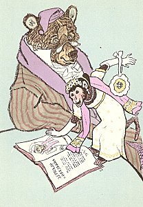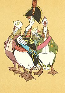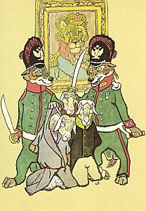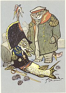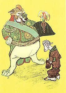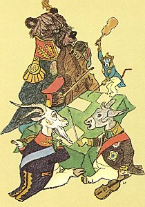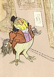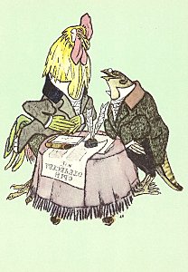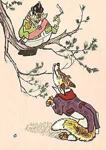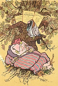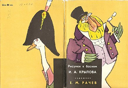 - 1961 Twelve cards displaying colored paintings of Krylov's fables by E.M. Rayev. 4⅛" x 5⅞". Moscow. $24.99 from Andrey Nosov, Narva, Estonia, through Ebay, Jan., '06. I have long been an admirer of Rayev's work. Here are twelve of them gathered in a wrap-around cover with details from two of the images: "Cock and Pearl" and "Geese." The images included here are, as far as I can surmise from the pictures and titles: