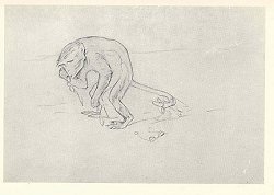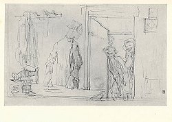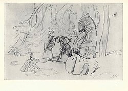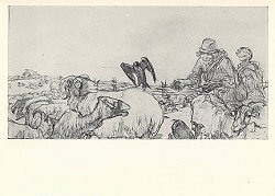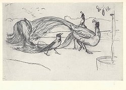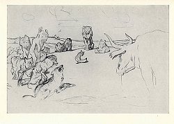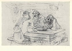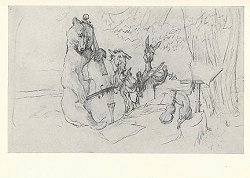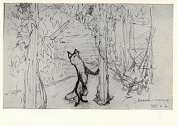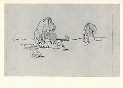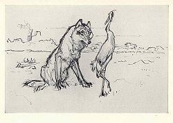 At first, these images may seem rather dull. Give them time. Several are very good. Among my favorites is "Three Townies" (VIII 23), in which one clever man eats the soup while the other two argue how to apportion it. The victim bull about to be seized upon by all the animals in "The Plague of Beasts" (II 4) is also well suggested by the light lines against the heavier lines of the other beasts. The lion in "The Lion and the Wolf" (V 14) lets the wolf know that puppies can get away with things not allowed to wolves. Trishka's caftan (IV 8) may only be suggested, but the laughter of others at his expense is clear. Notice that there are two different renditions of "A Quartet" (IV 1). - Date