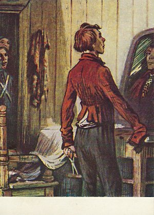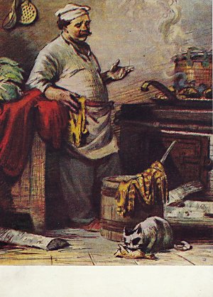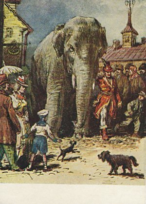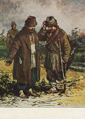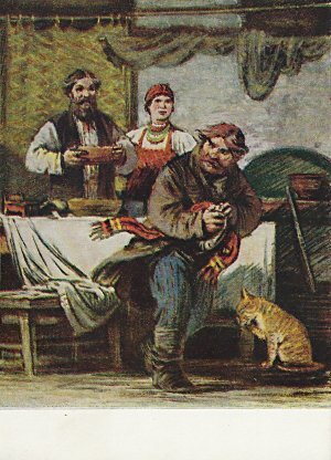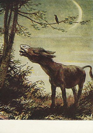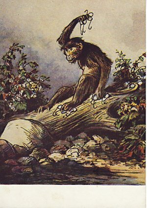 These cards, about 4" x 6", all are portrait and have a white strip at the bottom of their picture side. Though the cards – and perhaps the paintings as well – are not of the highest artistic quality, I enjoy seeing Krylov's fables put into pictures. Look below to find the thumbnails of the ten cards, and then click on them. - Date